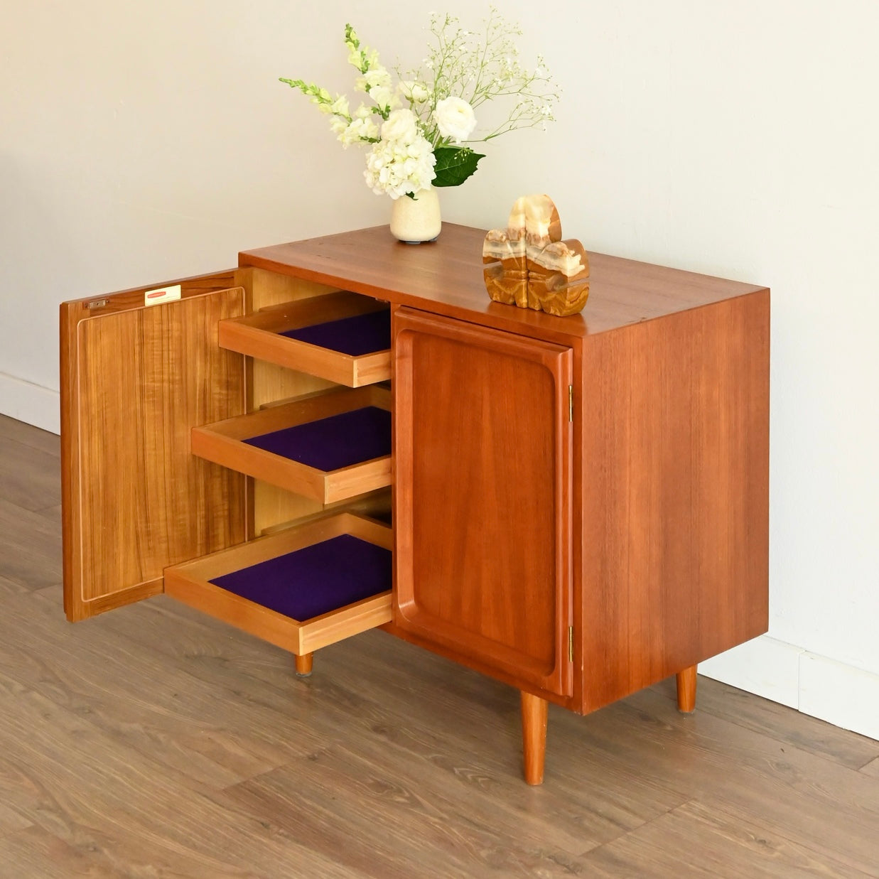 Classic Australian made cabinet by Chiswell circa 1970s. This piece presents in good vintage condition, the top face has imperfections to the left (photographed). Beautiful felt lined drawers on the left internal compartment, a single adjustable shelf on the right. Popular proud profile door trim.  Elevated on tapered timber legs.