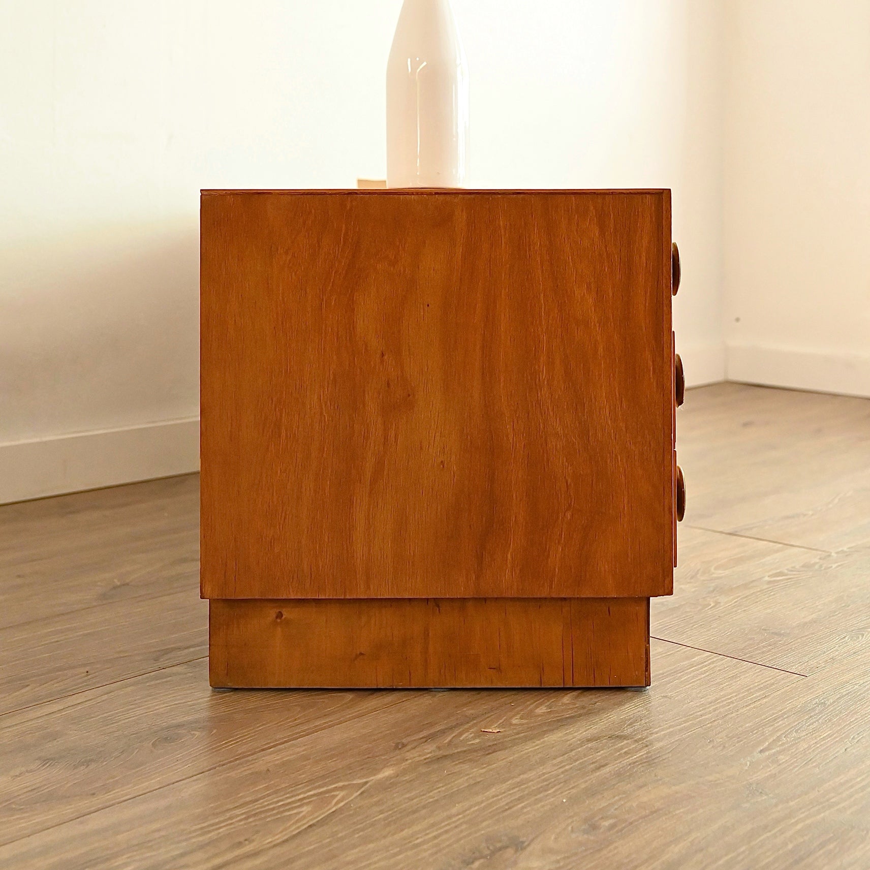 Classic Australian made piece circa 1960s. This piece presents in good vintage condition with only minor imperfections commensurate with age, including a small chip to one of the drawer handles. A lovely design, with contrasting maple veneer patterns and round handles.