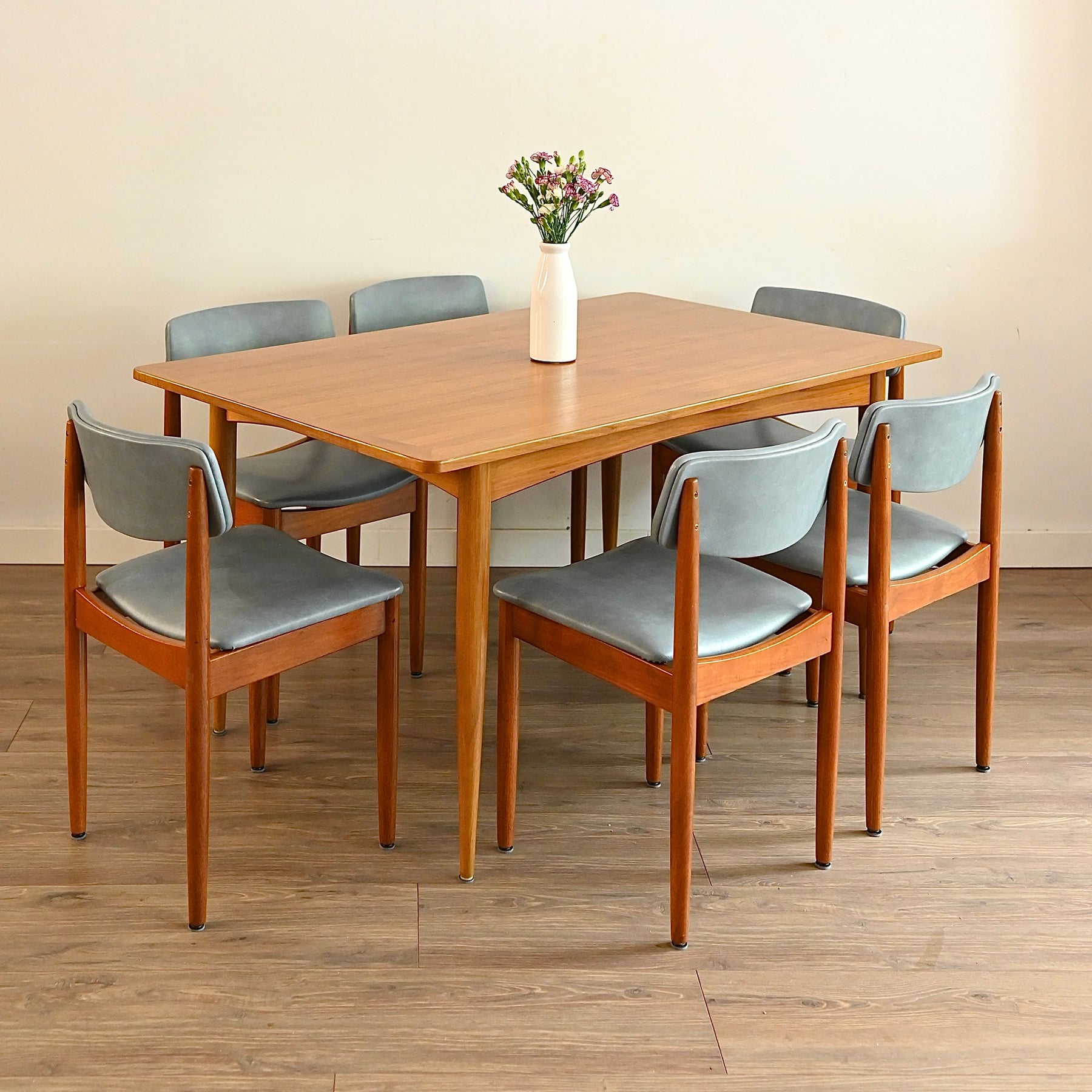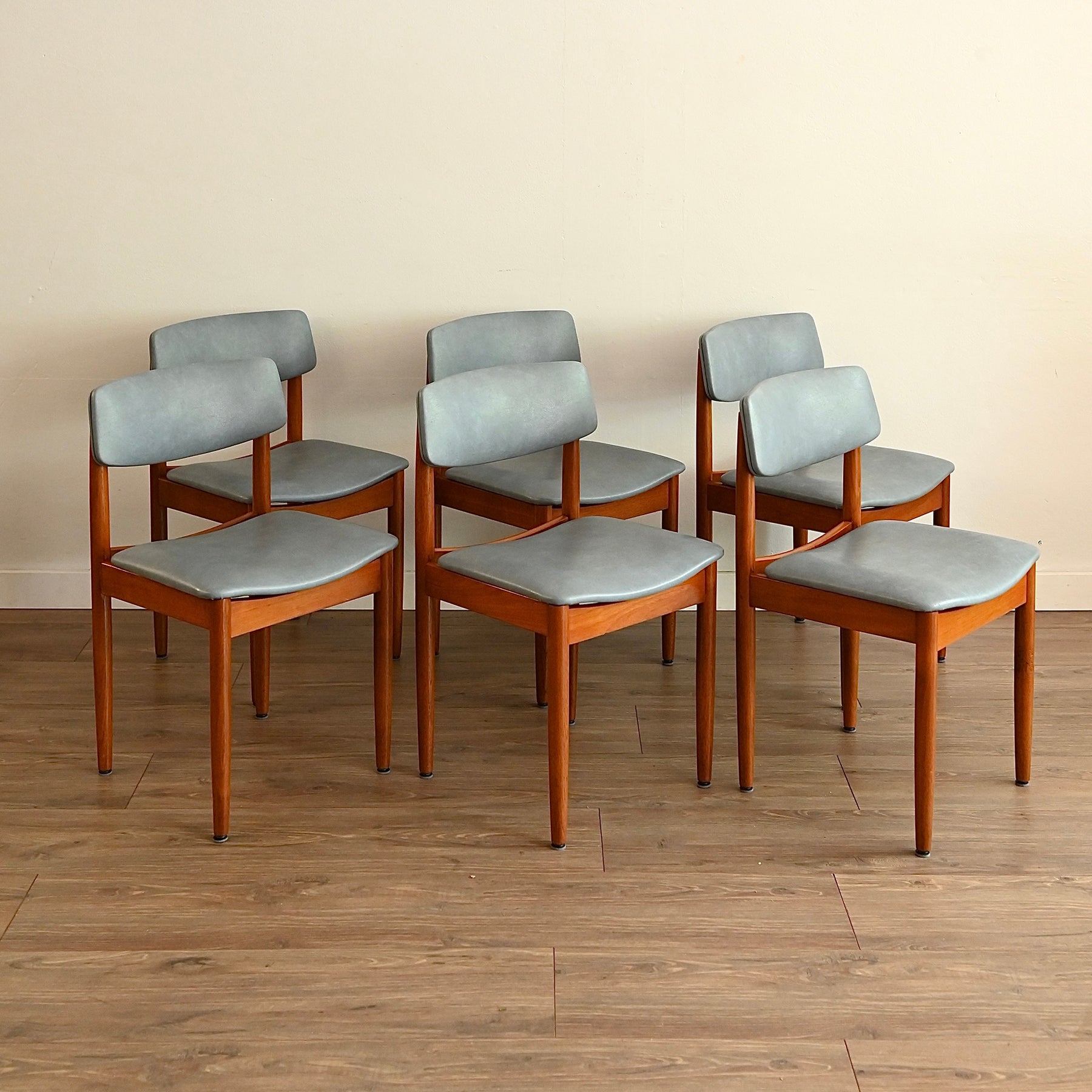6x Mid Century Teak Blue Vinyl Dining Chairs by Chiswell