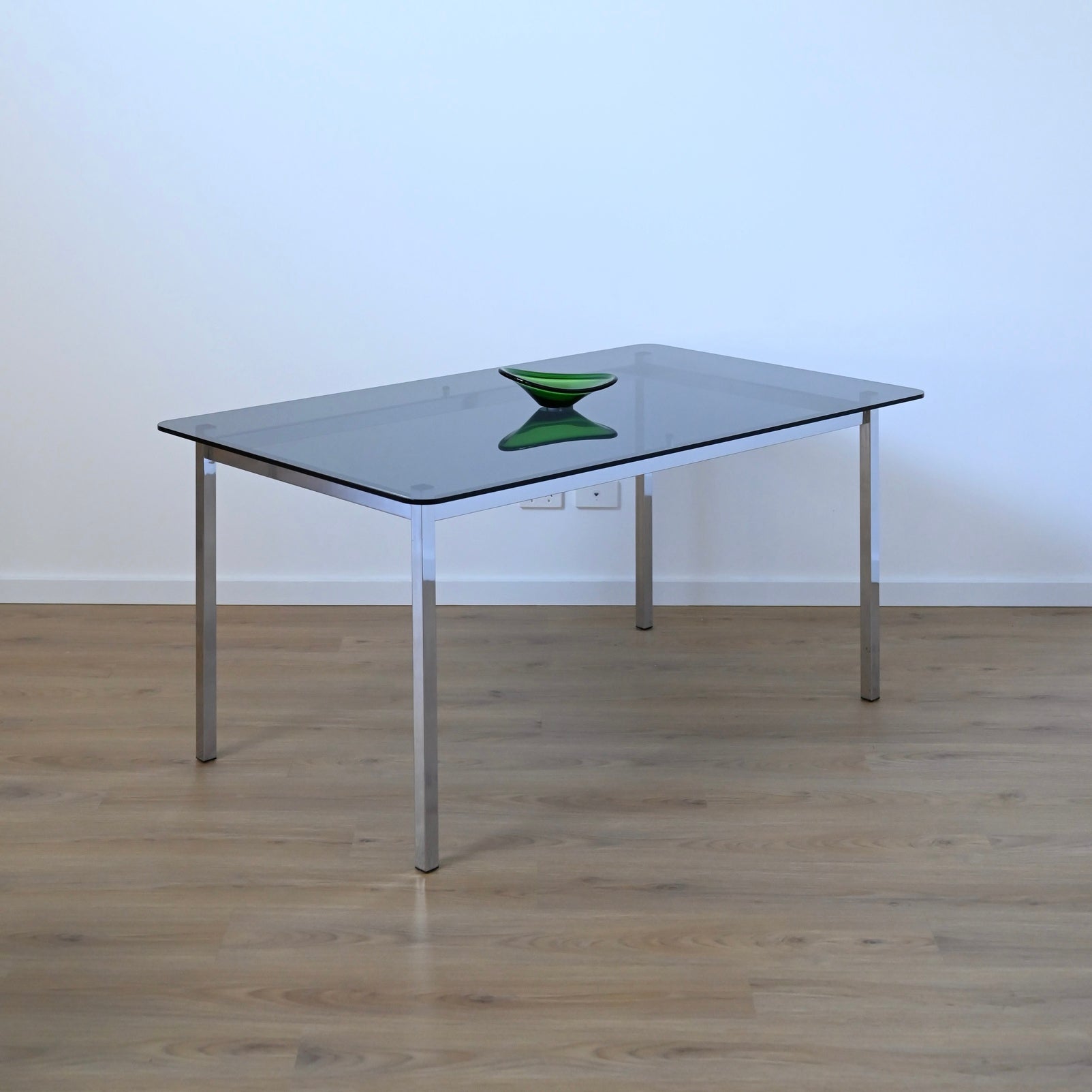Very cool dining setting made by ULTRA in Victoria circa 1970s. This set presents in very good vintage condition. The original blue striped velvet upholstery is a real gem and is the feature of the set. The chrome frames are sturdy and have been polished. Minor areas of tarnishing remain common with age. The thick smoked glass top presents in great condition with no chips and only minor scratches expected with age. Sold as a set only.