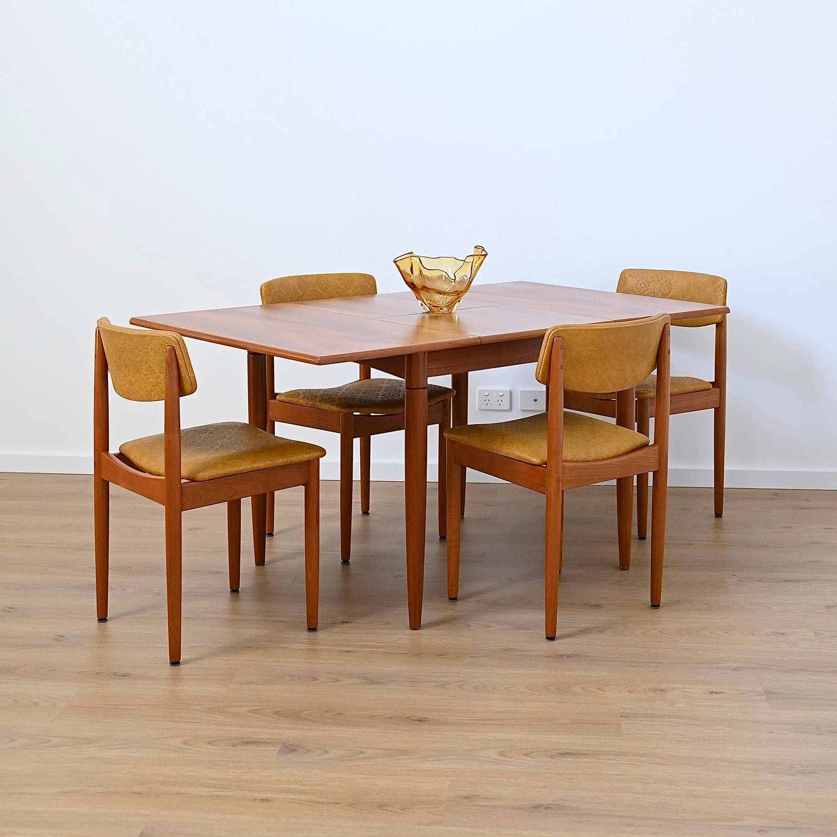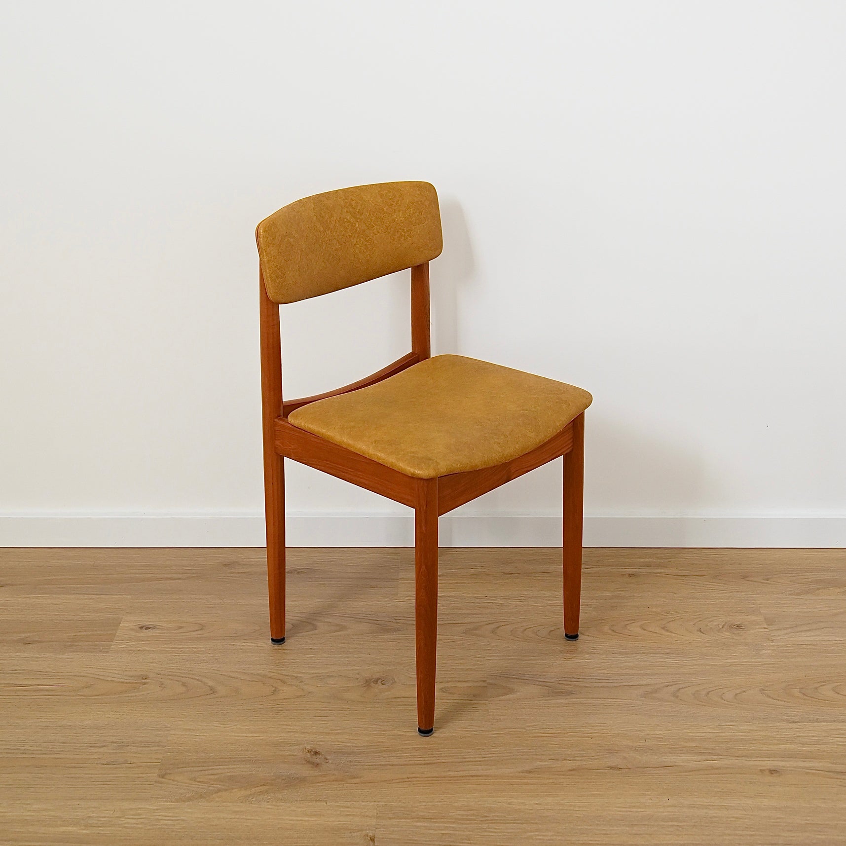 Mid Century Teak and Mustard Vinyl Dining Chairs by Chiswell x4