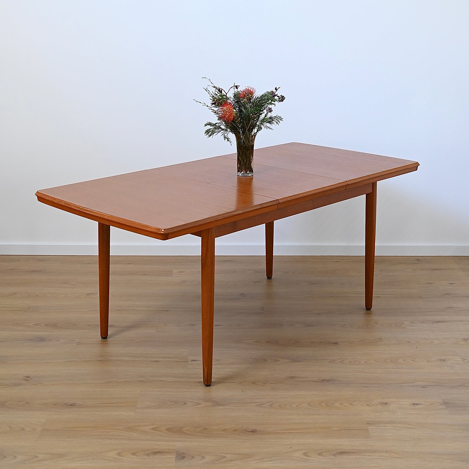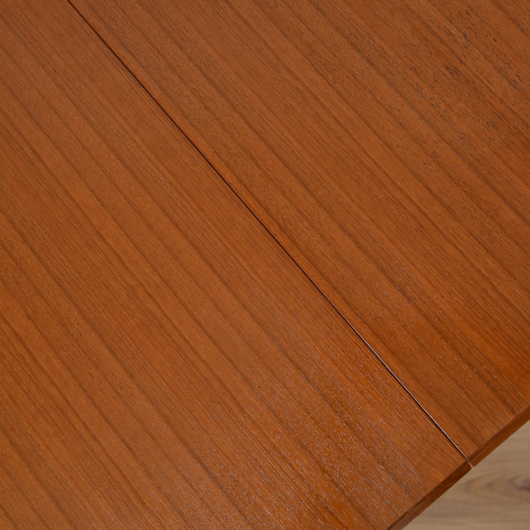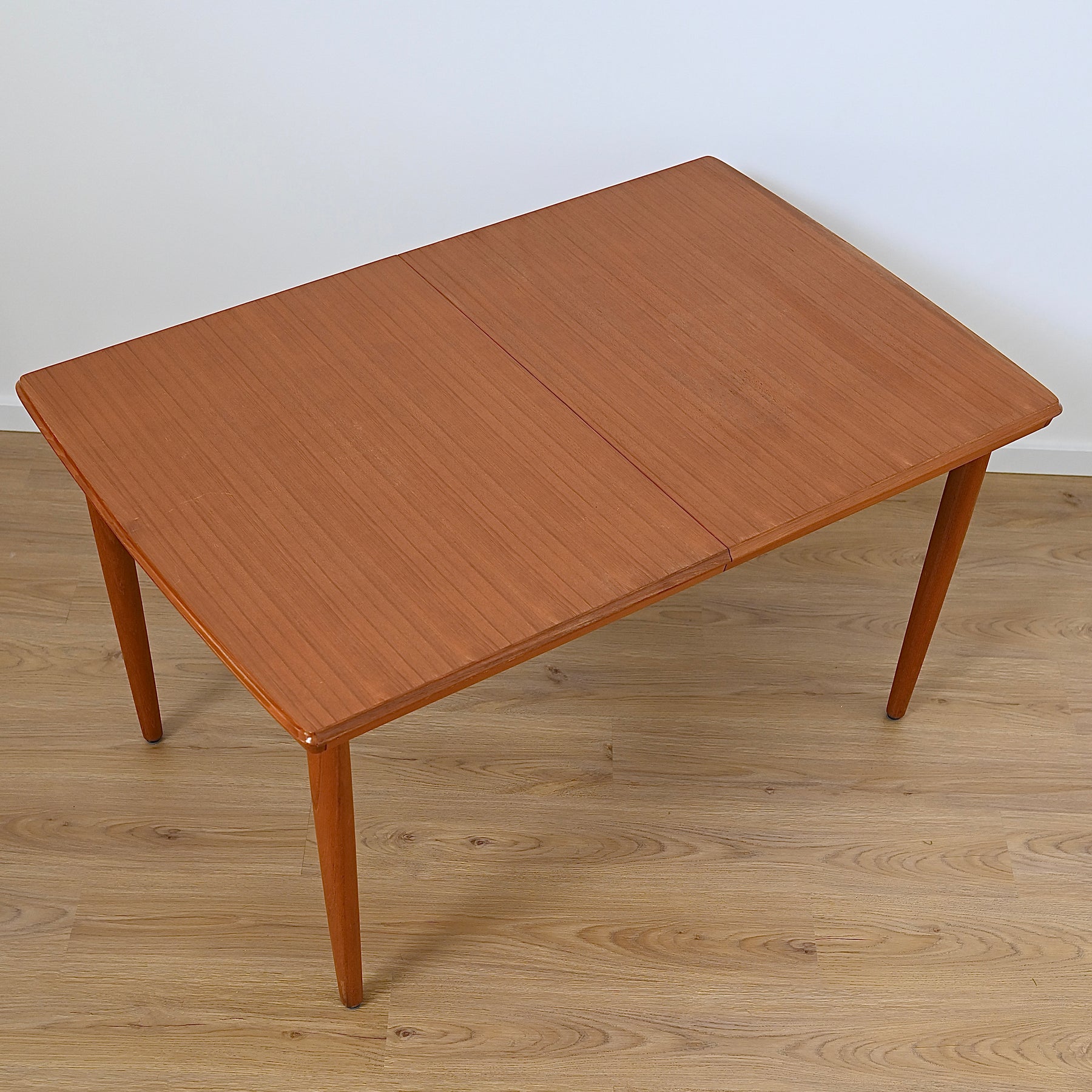 The top face has been refreshed with a wax based product.  Extends using a robust butterfly system. Tapered Teak legs. Seats 4-6.