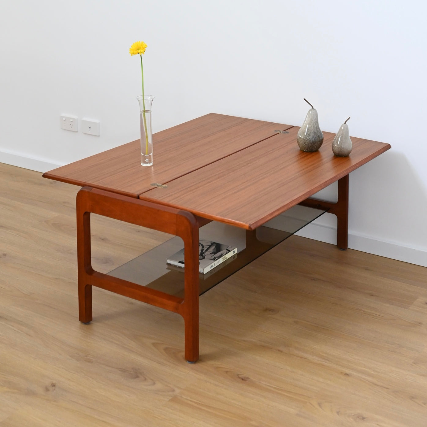 Really unique piece by Chiswell circa 1970s. Presents in great vintage condition. Use as a coffee table, console, games table. Has a felted compartment below the sliding table top. Comes with a smoked glass magazine shelf. Some imperfections to the top face (when in it’s condensed form) as per photos. Extended table is in excellent condition. Has been tastefully refreshed with a wax based product by our team, sturdy and functions perfectly well.