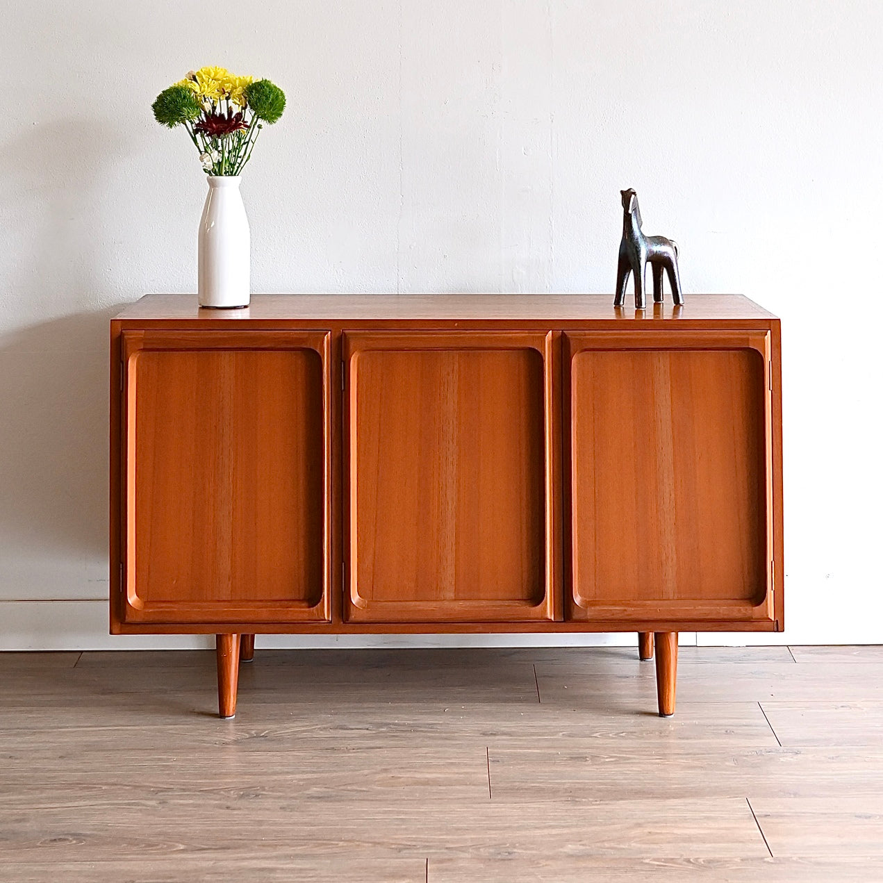 Classic Australian made piece by Chiswell circa 1970s. Presents in great vintage condition with only minor imperfections to the top. Popular deep profile door trim. Adjustable shelf. Fits records. Elevated on tapered timber legs.