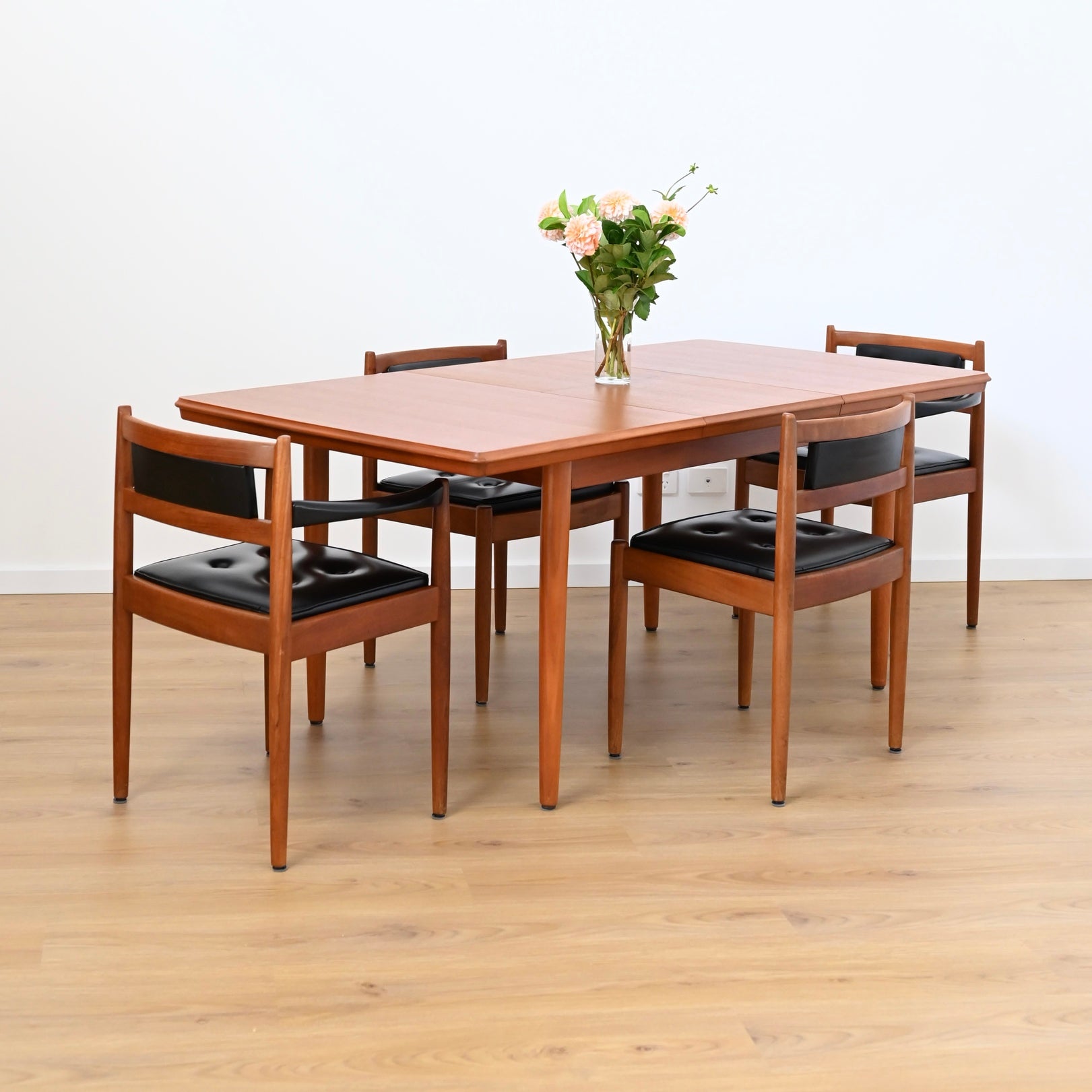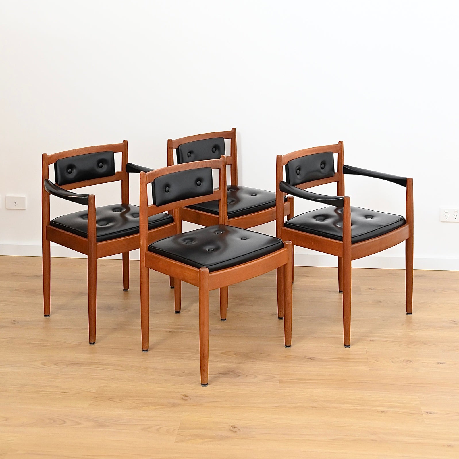 Really great set of 4 dining chairs by Chiswell. Less common design. Features original black vinyl coverings. Supportive, cushioned and comfortable bases and backrests. Excellent vintage condition overall. 2x standard chairs, 2x Carvers.