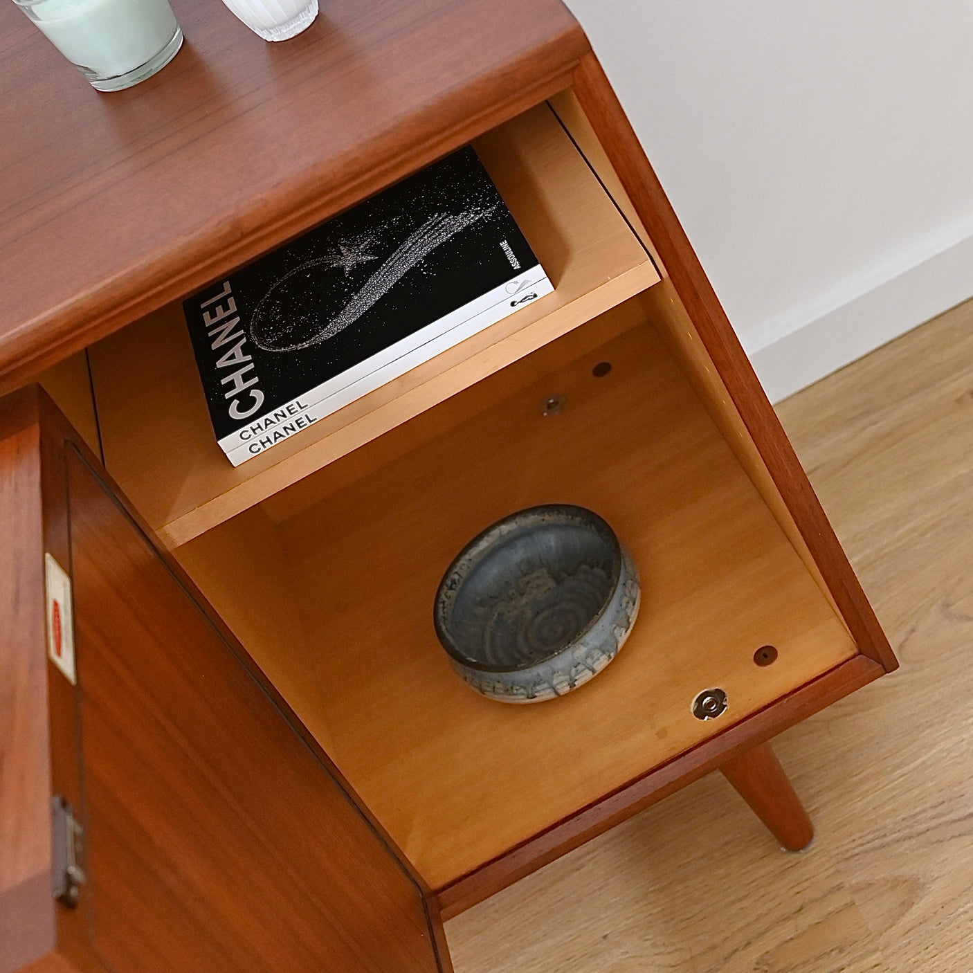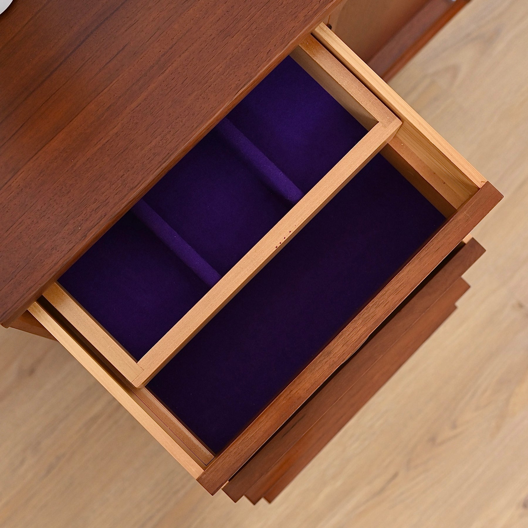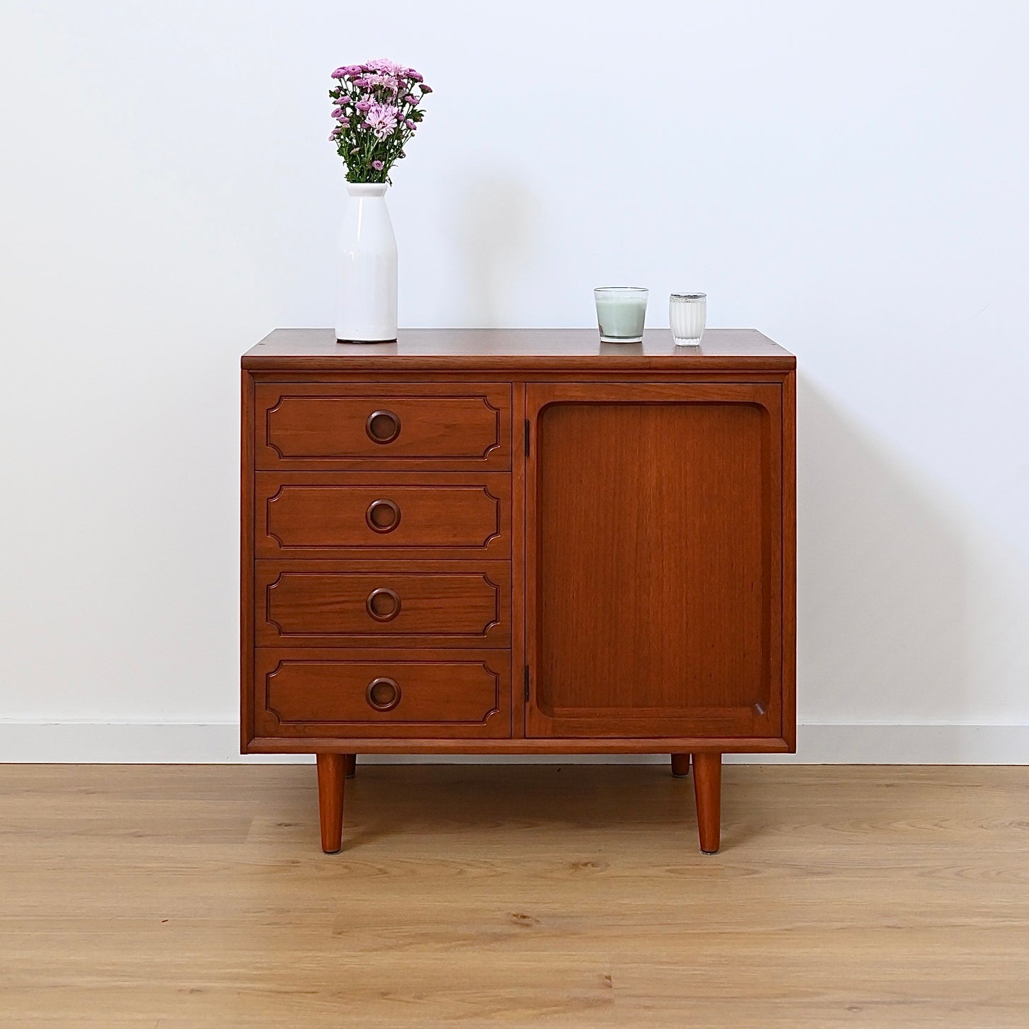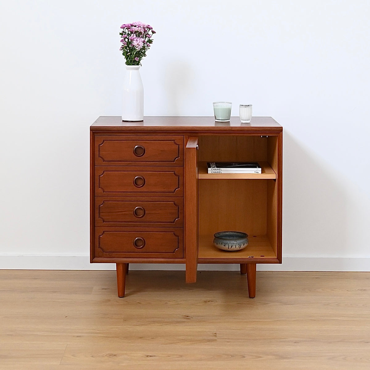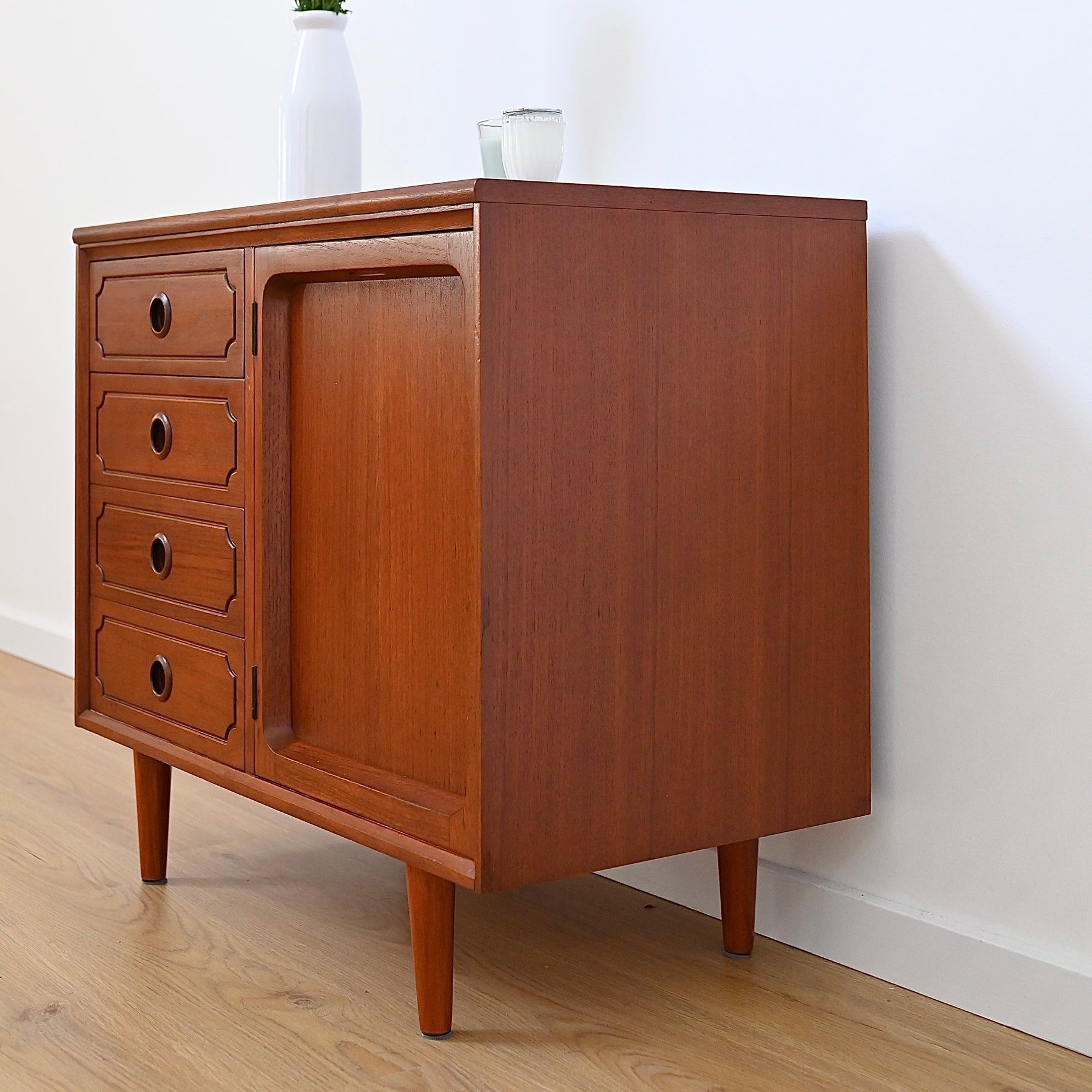 Classic Australian made piece by Chiswell circa 1970s. Presents in great vintage condition. Popular deep profile door trim.  Four decorative drawers on the left hand side with original purple felt in the top drawer. Minor imperfections commensurate with age (photographed) luckily well hidden by the deep walnut colour. Adjustable shelf, fits records. Elevated on tapered timber legs.