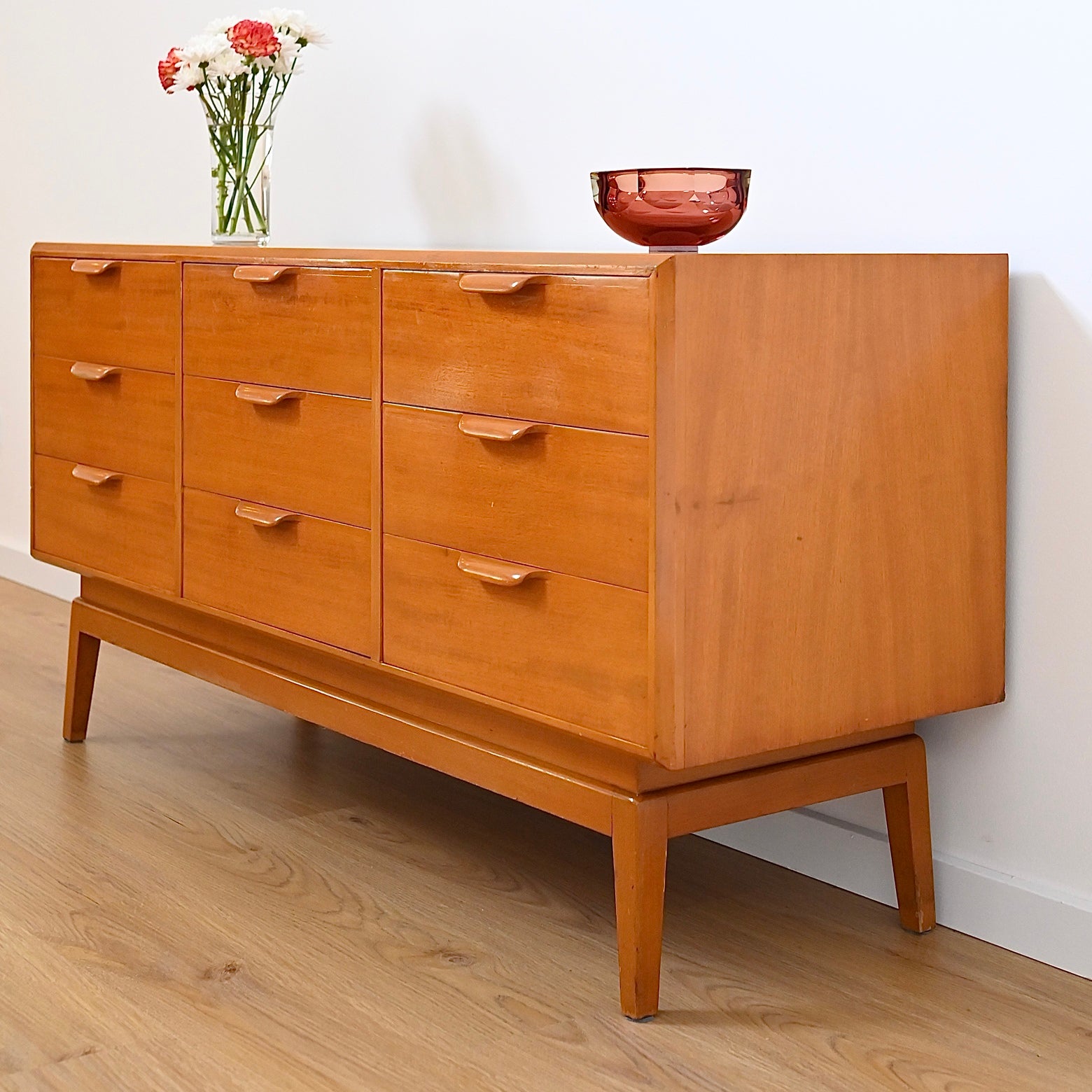 Classic Australian made low boy circa 1970s. Presents in excellent vintage condition with only minor imperfections. 9 drawers, lip handles. Solid blackwood subframe and legs. Nice lines, stunning timber grain pattern.