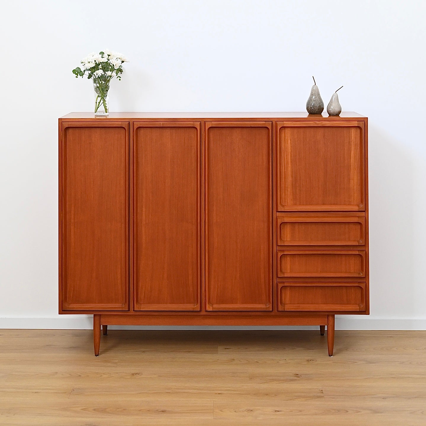 Classic Australian made piece by Chiswell circa 1970s. This impressive 4 bay factory Koben model presents in great vintage condition, with only minor imperfections to the top face if inspected closely. Impressive and popular proud profile door trim. Adjustable shelves. Factory legs and subframe.