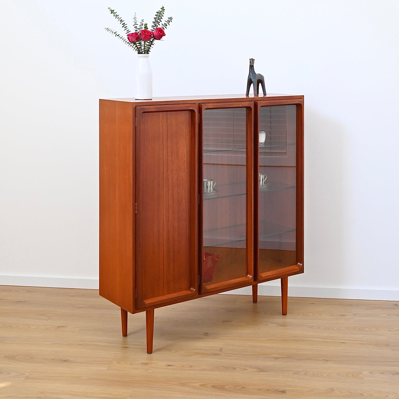 Classic Australian made piece by Chiswell circa 1970s. Popular proud profile door trim. Presents in good vintage condition with only minor imperfections. Adjustable shelves. Fits records. Elevated on tapered timber legs.