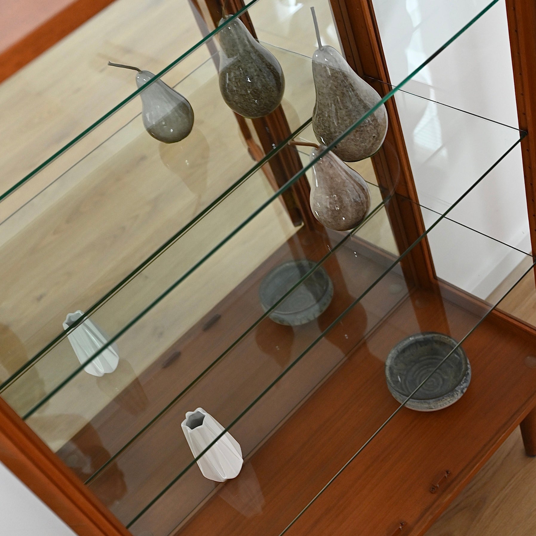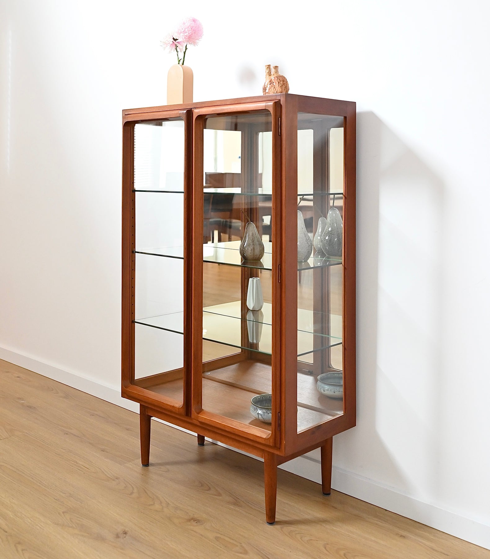 Classic Australian made piece by Chiswell circa 1970s. Presents in excellent vintage condition hard to spot any imperfections on this piece. Popular proud profile door trim. Adjustable glass shelves. This has original Chiswell legs and cannot be customised unlike our other display cabinets.