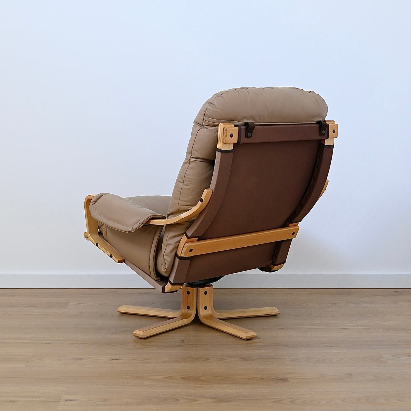 Classic Australian made set by Tessa circa 1990s. Lovely neutral colours, featuring blonde bentwood frames and a light tan full grain leather upholstery. Presents in great vintage condition, very comfortable, minor wear to the armrests. Includes 1x 2 seater, 1x single seater swivel and an ottoman.